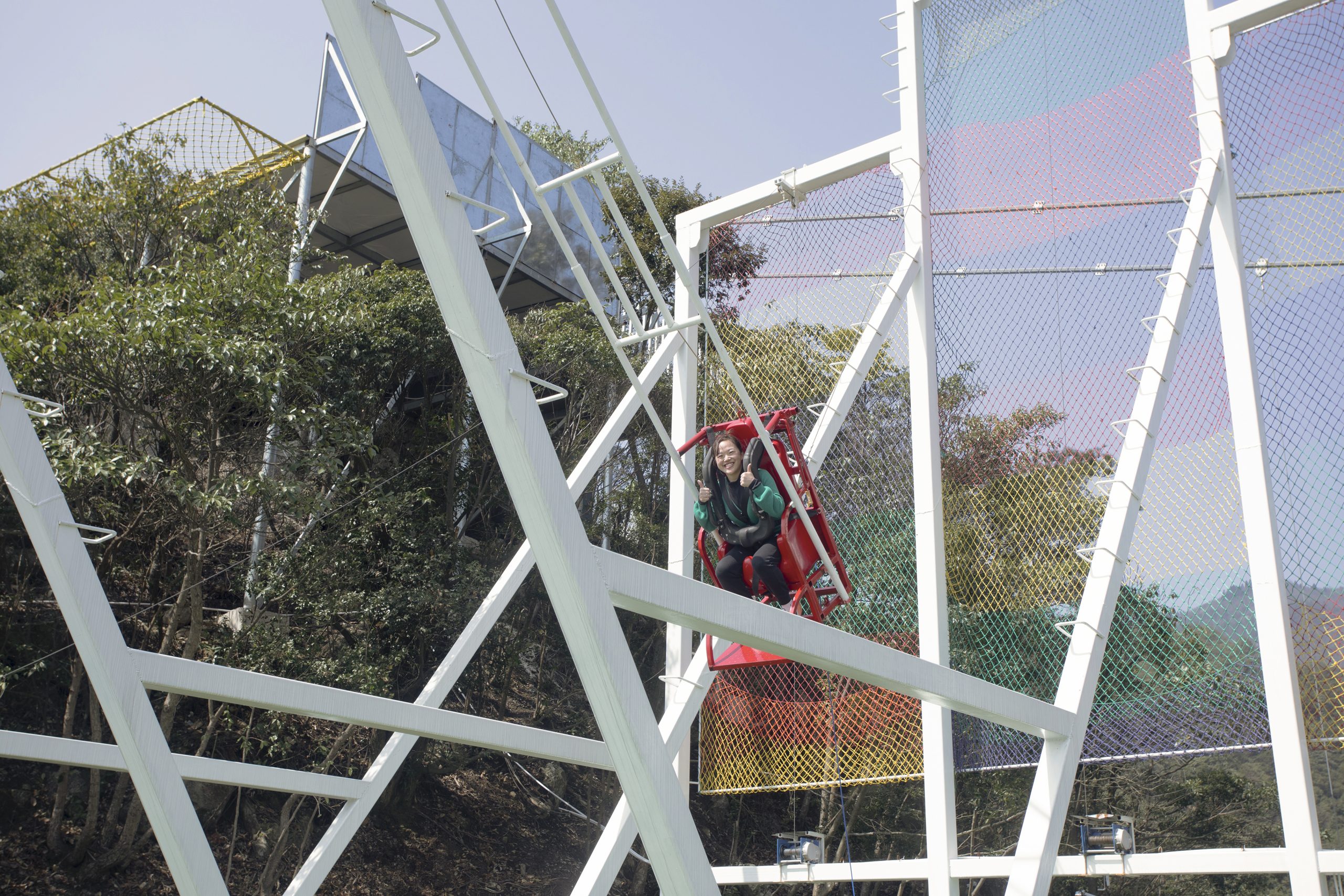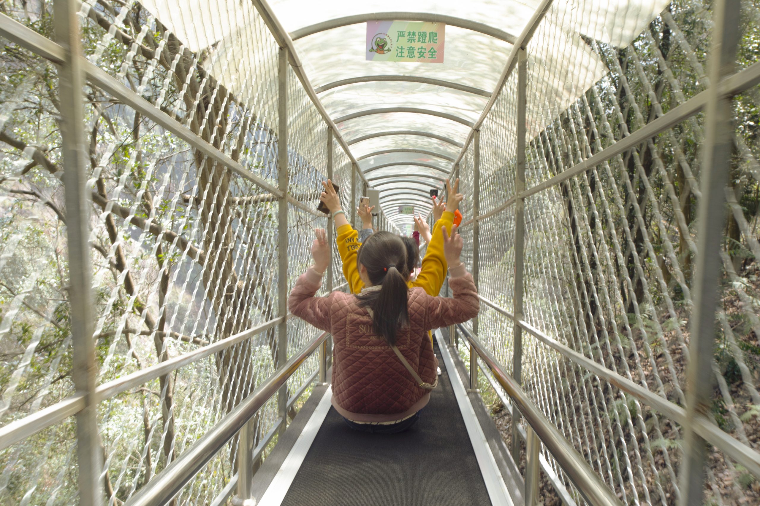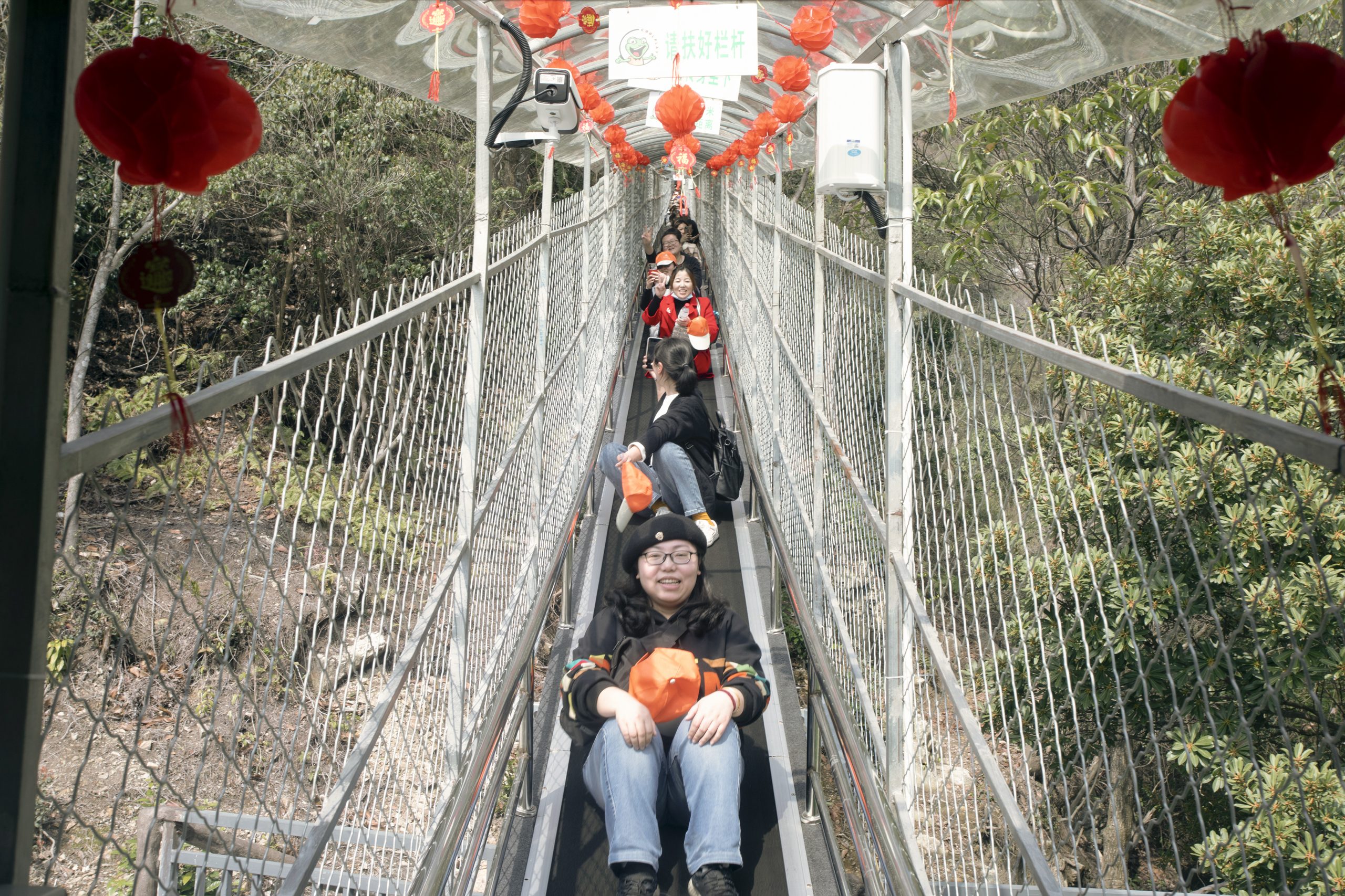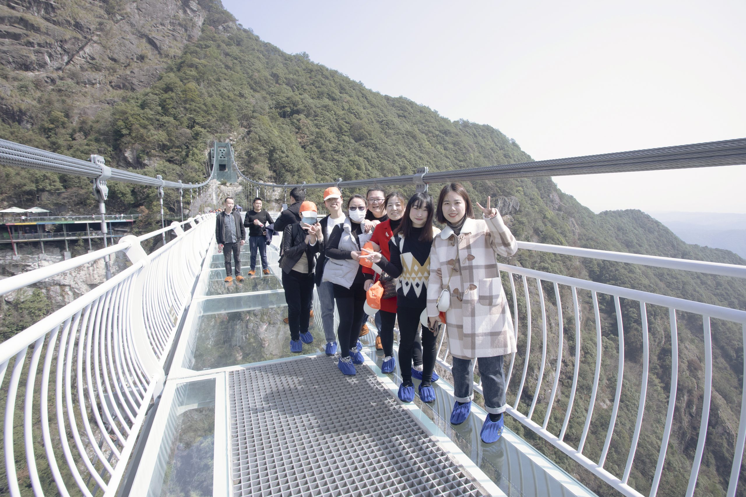 ? ? ? 到了半山腰,大家又體驗(yàn)了一把飛天魔毯,它全長310米,是懶人爬山神器,坐上傳送帶,大家可以輕松登頂,而且還能欣賞兩邊的風(fēng)景。下了飛天魔毯就到了梁皇山景區(qū)的核心區(qū)——全長318米的連云渡玻璃棧橋。玻璃橋宛若銀龍橫跨山崖,真是人在橋上走,云在身邊飄,走在橋上還能感覺到橫風(fēng)帶來的輕微的顫動(dòng)。雖然踩在上面是有驚無險(xiǎn),不少小姐姐還是揪著心,不敢往下看,牽著同事的手趕緊走過去;當(dāng)然,也有些膽大的不停地拍攝合影,留戀不肯離開。