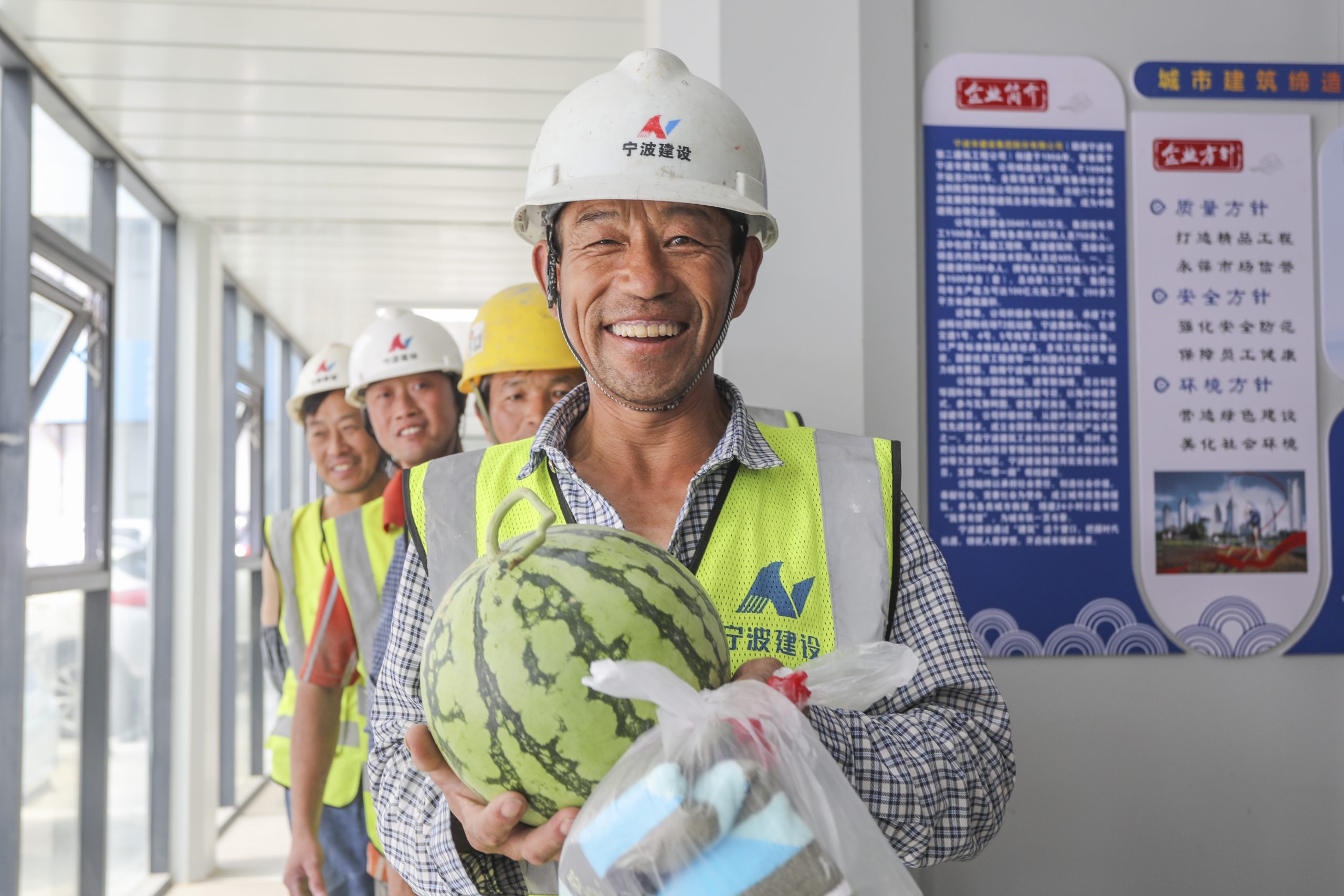 ? ? ? ? 今年入夏以來(lái),寧波連續(xù)高溫,各項(xiàng)目部施工作業(yè)人員冒著酷暑堅(jiān)守崗位戰(zhàn)高溫、灑汗水。為了向一線(xiàn)工作者們表達(dá)敬意和尊重,給他們送去切實(shí)的關(guān)心和慰問(wèn),7-8月間,寧波建設(shè)集團(tuán)工會(huì)開(kāi)展大規(guī)模高溫慰問(wèn)活動(dòng),為一線(xiàn)職工送去夏日清涼。集團(tuán)公司工會(huì)主席苗志春、黨群工作部經(jīng)理杜寧、人力資源部經(jīng)理姜遠(yuǎn)宇等一行先后來(lái)到北侖、余姚、奉化、市區(qū)等近40個(gè)項(xiàng)目部、生產(chǎn)車(chē)間一線(xiàn),為超過(guò)1100名一線(xiàn)作業(yè)人員送去藿香正氣水、龍湖清涼油等防暑降溫藥品和洗發(fā)水、沐浴露等生活必需品。
