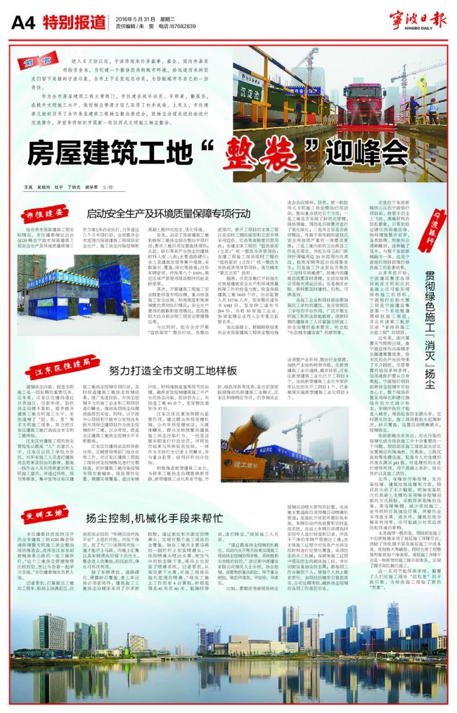 《寧波日報(bào)》2016.05.31.A4版:房屋建筑工地“整裝”迎峰會(huì)